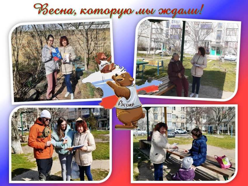 Сотрудники библиотеки-филиала №15 им. А. С. Грина для жителей пгт. Комсомольское провели акцию «Весна, которую мы ждали», приуроченную ко Дню воссоединения Крыма с Россией.