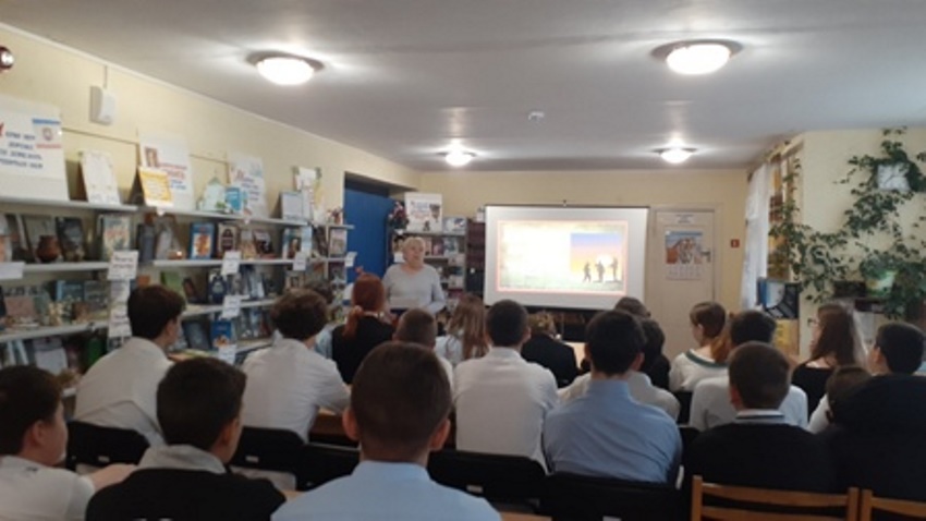 Заведующая библиотекой рассказала о героях – российских военнослужащих, участвующих в специальной военной операции, которые защищают интересы нашей страны и нашего народа. Вместе с ребятами вспомнили выпускников школы Кичинского Ивана и Шпыхова Виктора, отдавших свою жизнь в ходе специальной военной операции. Рассказ сопровождался видеопрезентацией.