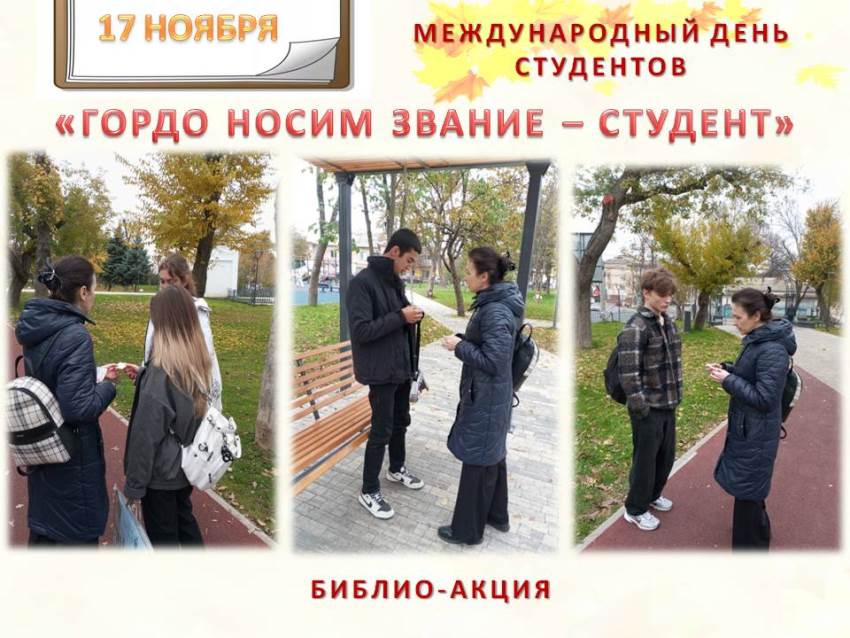 17 ноября ежегодно отмечается Международный день студентов. Он был учрежден в 1941 году в Лондоне на международной встрече студенческого сообщества, в память о чешских студентах – патриотах, выступивших против фашизма. В преддверии этой значимой даты библиотека-филиал № 4 им. М. М. Коцюбинского подготовила библиоакцию «Гордо носим звание – студент».