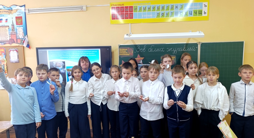 Библиотекарь рассказала ребятам о том, что 22 октября по всей России и за ее пределами отмечают праздник День белых журавлей, созданный по инициативе дагестанского поэта Расула Гамзатова, автора текста знаменитой песни «Журавли». Учащиеся узнали историю создания этой песни, которая стала песней-молитвой, гимном памяти, погибшим во время Великой Отечественной войны солдатам.