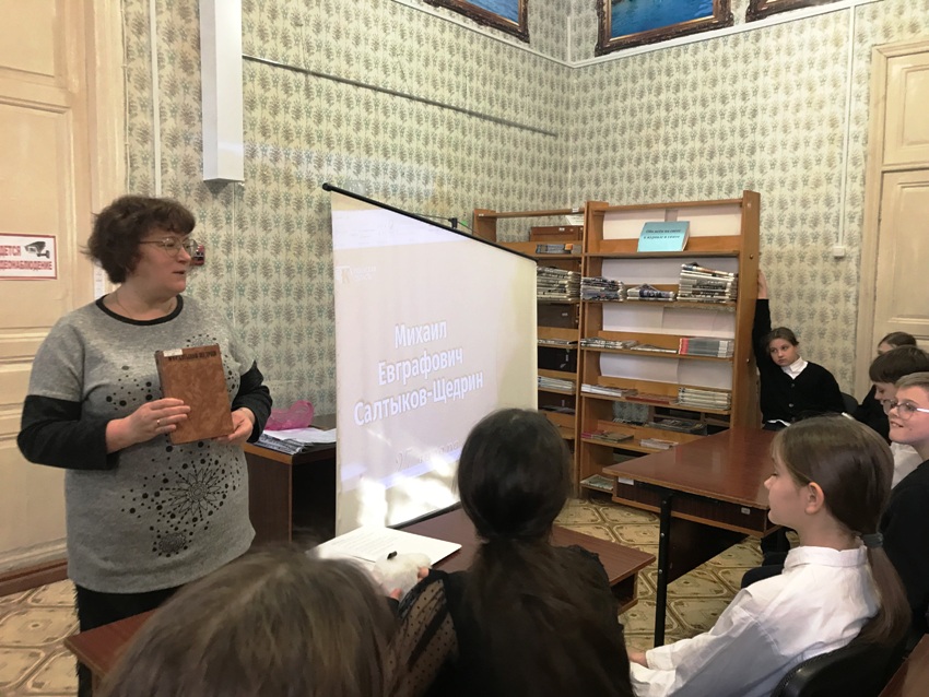Библиотекари познакомили ребят с фактами биографии и творчества выдающегося русского писателя-реалиста, журналиста, государственного деятеля. Рассказ о детстве писателя, о годах учебы, о службе, которая дала ему столько материала для его острых произведений, сопровождался показом фрагментов мультфильмов, снятых по его сказкам.