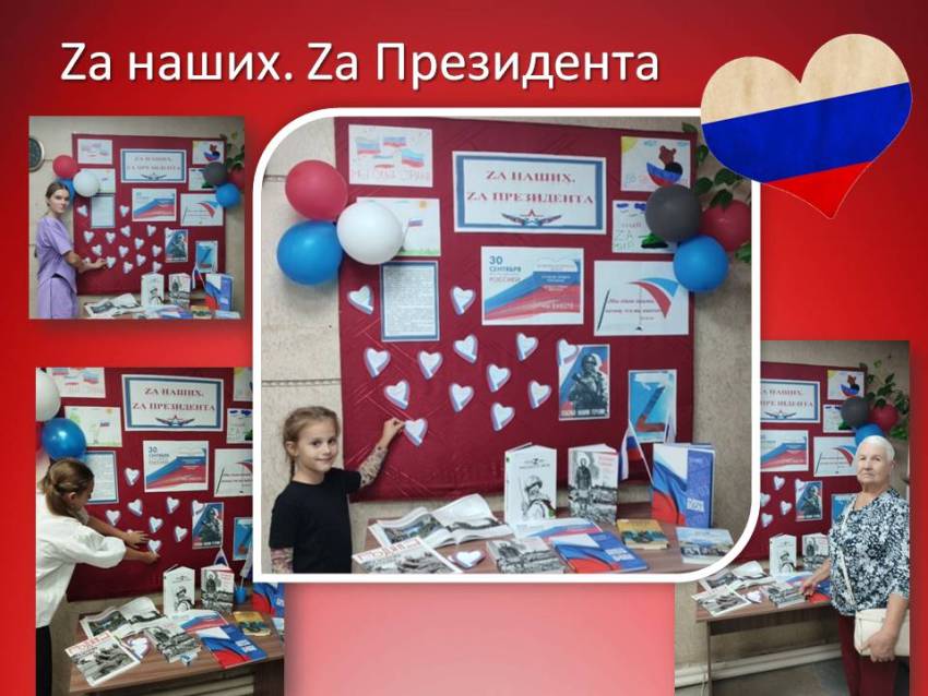 К этому празднику в библиотеке оформлена тематическая выставка «Za наших. Za Президента», в рамках которой пользователи могут ознакомиться с историями новых территорий, узнать о Героях специальной военной операции, информацией об их боевом пути и наградах. В этот предпраздничный день читатели библиотеки написали на сердечках свои искренние пожелания жителям новых территорий и прикрепили их на выставочный стенд. А юные читатели библиотеки оставили свои поздравления в виде красивых рисунков.