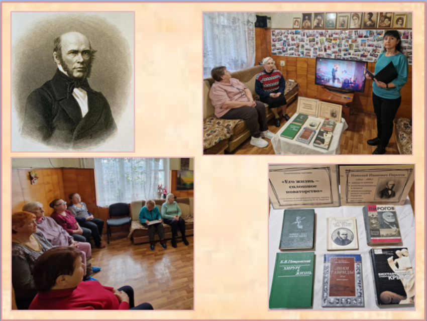 К 215-летию со дня рождения анатома, хирурга, новатора полевой хирургии Н. И. Пирогова сотрудники библиотеки-филиала №9 им. Л. Н. Толстого провели для слушателей cоциально-реабилитационного отделения граждан пожилого возраста и инвалидов №2 познавательный час «Страницы жизни великого хирурга».